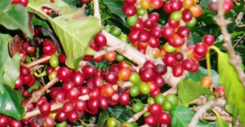 A coffee tree with many ripe coffee cherries. A single tree will produce approximately a pound of finished roasted coffee.